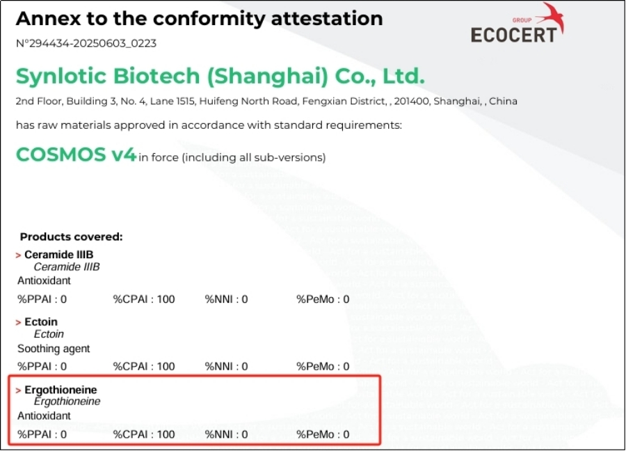 Наскоро ерготовата сяра, произведена от Shanghai Yunluo, получи ЕС COSMOS естествен сертификат, предоставен от ECOCERT във Франция.